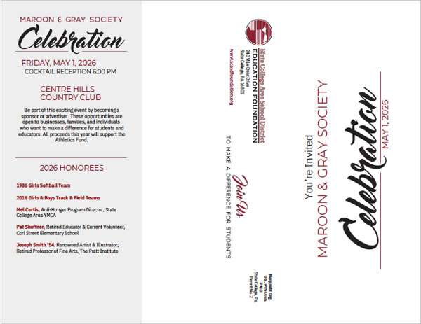 To be part of the Maroon & Gray Celebration as a sponsor or program advertiser, use the links to the right or contact Executive Director Paul Olivett at (814) 883-8067 or at paul@scasdfoundation.org.